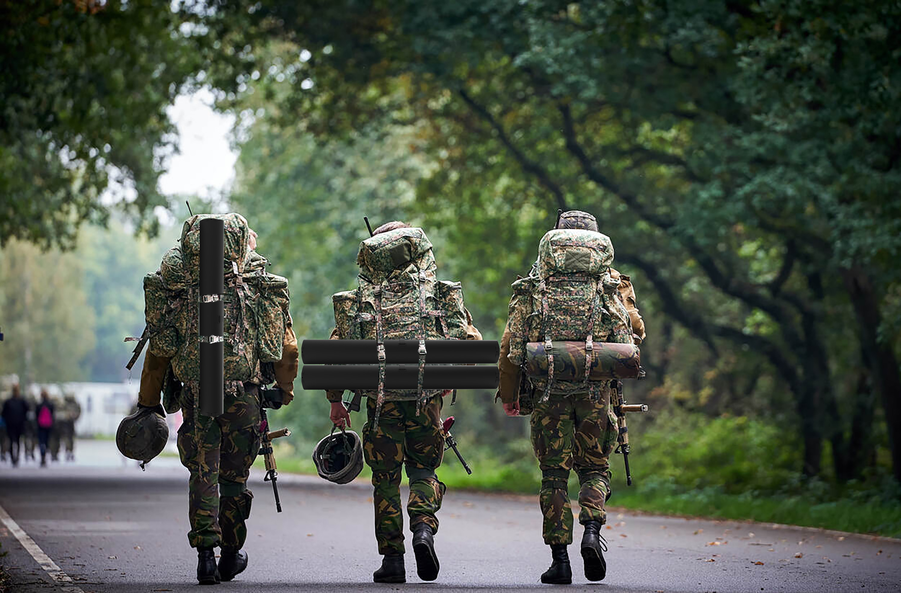 - Transport efficiency: fits onto a backpack with straps and can be worn on standard military armor. Different use of lightweight materials, incl. Dyneema.